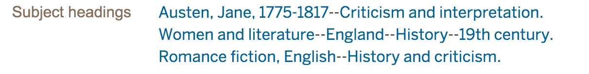 “Women and literature” indicates that the book is about a female author and “England—History—19th century” specifies that the title is focused on women and literature in England in the 19th century. The final heading is even broader and focuses on genre. Since Jane Austen wrote fiction, any book about her work will likely carry this genre-specific label.